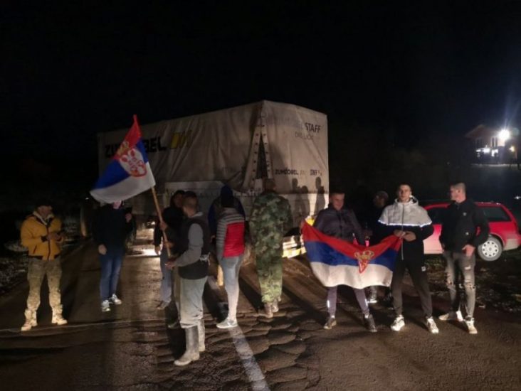 Sipas mediave në Kosovë, të paktën 20 serbë me flamuj në duar kanë ngritur pengesën në anën serbe të kufirit në zonën e Kurshumlisë, duke vendosur dy kamionë.