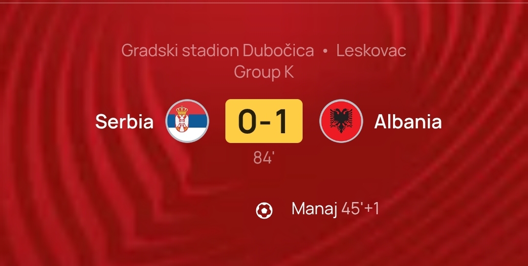 Atëherë kur dukej se pjesa e parë po mbyllej me barazim, Rei Manaj shtangu portierin serb me goditjen nga brenda zonës, duke shënuar një supergol në fund të pjesës së parë.