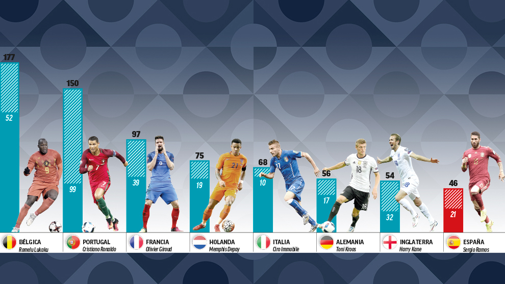 Pavarësisht se ka Cristiano Ronaldon dhe 99 golat e tij me ekipin kombëtar, Portugalia nuk ekipi që grumbullon më shumë gola nga lojtarët e thirrur për ndeshjet e fundit. 150 golat e luzitanëve mbeten prapa “Djajve të Kuq” (Belgjikës). Me 52 gola për vendin e tij, Lukaku pasohet nga Hazard (32), plus De Bruyne (19) dhe Mertens (38). Rivalja e Spanjës, të enjten në Stuttgart, Gjermania, nuk paraqet një ekuilibër të shkëlqyeshëm: 56 gola në total, me Kroos (17) si shënues. Por Löw ka lënë një pjesë të madhe të ekipit të tij bazë jashtë kësaj liste, përfshirë 13 golat e Gnabry në 13 ndeshje dhe 11 golat e Leon Goretzka në 25 ndeshje.