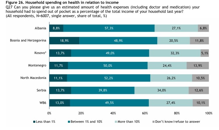 Matjet e bëra nga Këshilli i Bashkëpunimin Rajonal, RCC, tregojnë se shqiptarët shpenzojnë më shumë se të gjithë ballkanasit e tjerë për shërbimet e shëndetit. Më shumë se 57% e të anketuarve thonë se shpenzimet vjetore për shëndetin shkojnë deri në 10% të të ardhurave dhe 27% thonë se e kalon këtë nivel.