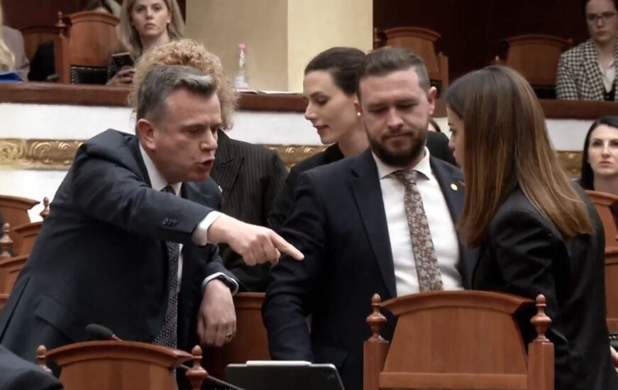 Deputetët e opozitës në grup bllokuan foltoren dhe nuk lejuan kolegët e mazhorancës që të mbanin fjalën. Bora Muzhaqi që po fliste nga vendi nuk u lejua nga deputetja demokrate Elda Hoti, e cila u filmua teksa i merrte kartën e deputetes.
