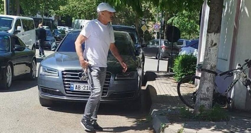 Një foto e shkëputur nga kamerat e sigurisë tregon Arjan Telhallarin të armatosur, teksa i drejtohet zyrës elektorale të Partisë Social-Demokrate (PSD) në rrugën “Ali Demi” në Tiranë.