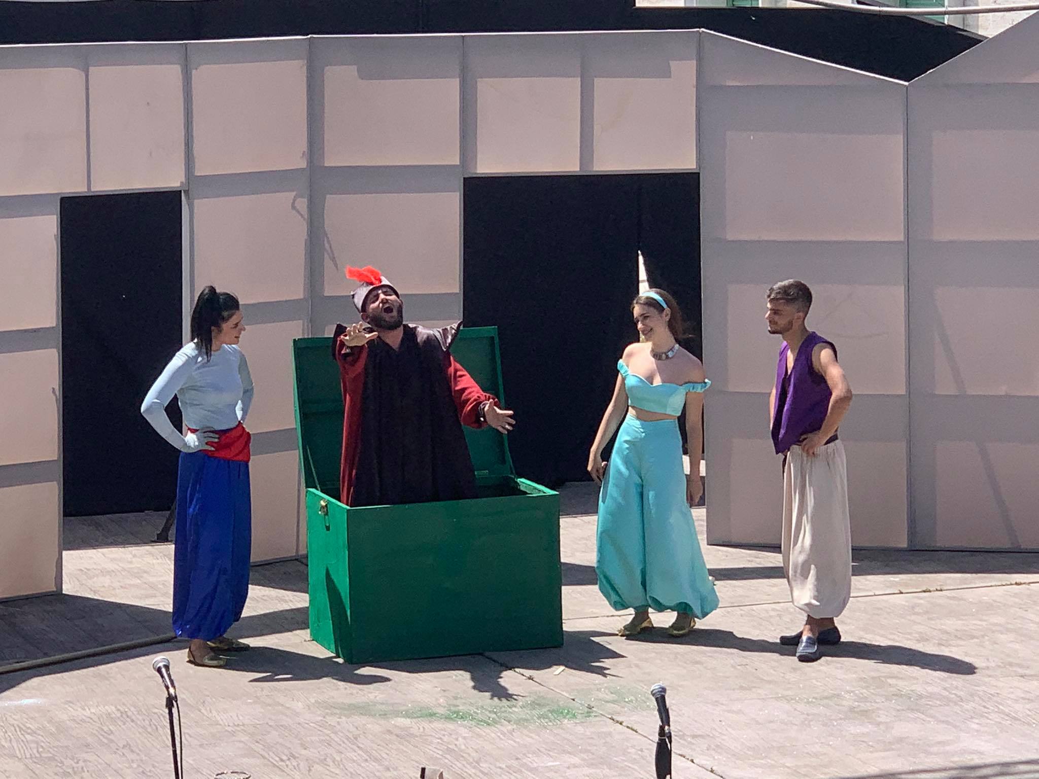 Shfaqja për fëmijë, “Aladdin”, erdhi më 8 dhe 9 maj si shfaqje muzikal ku ndërthuret aq bukur fjala, kënga dhe kërcimi dhe spektatorët e vegjël ulur në ndenjëset e sallës në natyrë shijuan performancën e aktorëve në ambientet e Amfiteatrit.