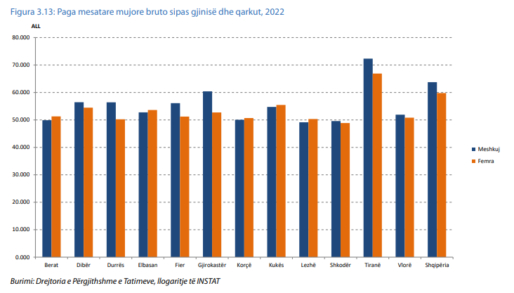 Referuar të dhënave sipas gjinisë, gjatë vitit 2022, meshkujt kanë nivelin e pagave më të lartë në qarkun e Tiranës (72.333 lekë) dhe më të ulët në qarkun e Lezhës (49.135 lekë). Pagat e punonjësve femra ishin përgjithësisht më të ulëta se ato të punonjësve meshkuj, por gjithashtu gratë kishin nivelin më të lartë të pagave në qarkun e Tiranës (66.911 lekë) dhe më të ulët në qarkun e Shkodrës (48.879 lekë). Në qarkun e Gjirokastër, meshkujt paguhen më shumë se femrat me rreth 12,76 %, ndërsa në qarkun e Lezhës meshkujt paguhen më pak se femrat me -4%.