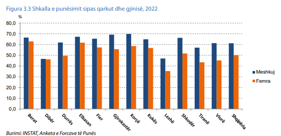 Sipas Instat, shkalla më e lartë e pjesëmarrjes në forcat e punës është regjistruar në qarkun e Korçës, Elbasanit dhe Beratit me rreth 70%. Ndërsa më e ulëta në qarkun e Lezhës dhe të Dibrës 53% dhe 56.5% përkatësish), ndërkohë që mesatarja për vendin është 62.4 % .