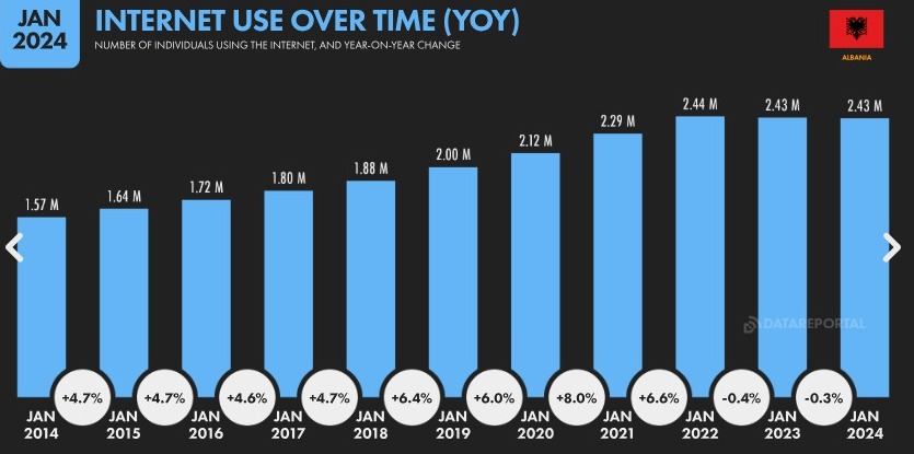 Shifra nga i njëjti raport tregojnë se 100% e shqiptarëve kanë akses në internet dhe në rrjete sociale, por për shkak të largimit të njerëzve, numri i përdoruesve ka rënë dy vitet e fundit.
