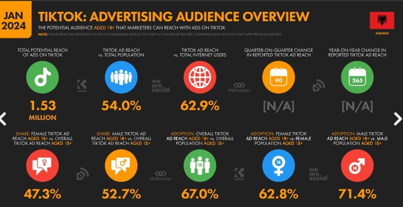 Të ndarë sipas gjinisë, 52.7% e audiencës së këtyre reklamave në TikTok në Shqipëri ishin meshkuj dhe 47.3% femra.