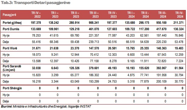 Transporti detar ka pësuar po ashtu rritje, me rreth 1.6 mln pasagjerë dhe më shumë se 2 milionë tonë mallra në 1 vit. Numri i anijeve të hyra dhe të dala nga portet në vend rezulton 266 anije, nga këto 235 anije janë të huaja dhe 31 anije vendase.