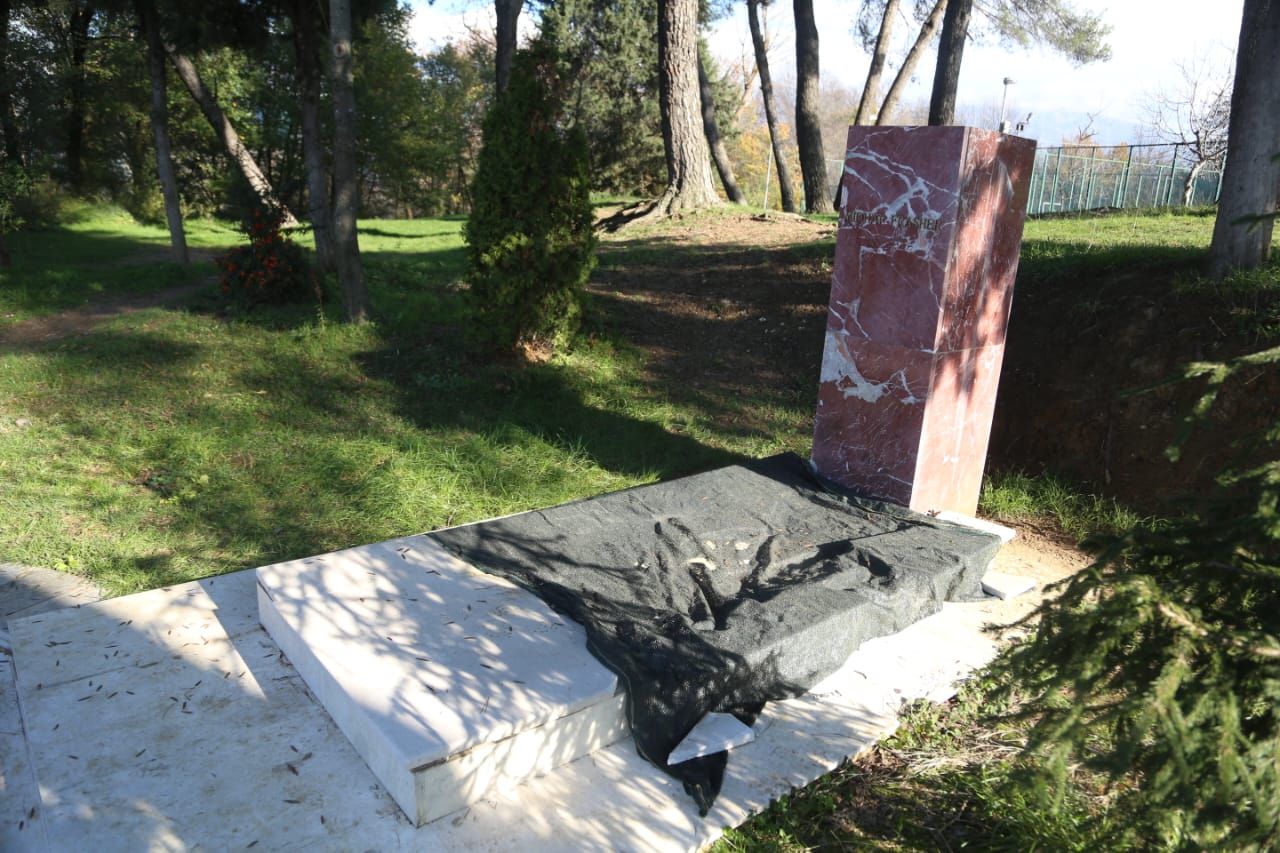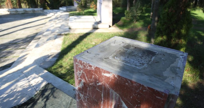 Busti është shkulur nga vendi dhe është rrëzuar në tokë, teksa janë thyer dhe pllakat e mermerit.