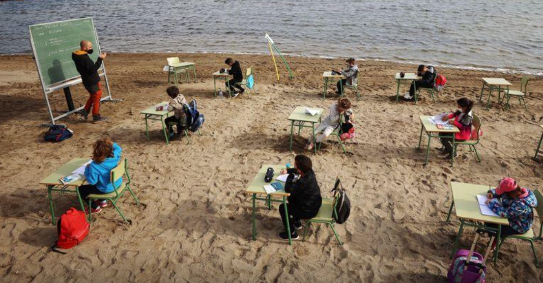 Shkolla online? Jo! Në Spanjë mësimi bëhet në plazh