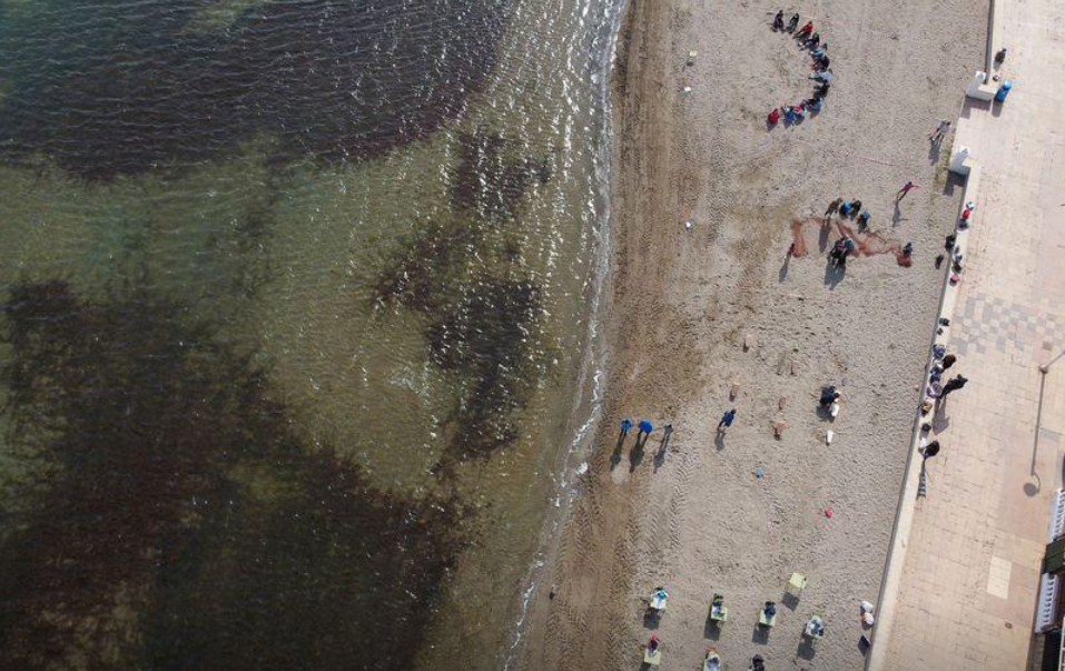 Jashtë shkollës Felix Rodriguez de la Fuente, fëmijët me maska ​​ulen përpara një dërrasë të zezë portative në rreshtat e tavolinave të gjelbërta të vendosura mjeshtërisht në brigjet me rërë të Playa de los Nietos (Plazhi i Nipërve).