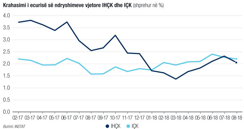 Inflacioni për gushtin shënoi 2,1 %. Shpenzimi i shqiptarëve për ushqime ka ndikuar më së shumti në rritjen e inflacionit për këtë muaj. Qytetarët shqiptarë kanë shpenzuar gjithashtu edhe për “Argëtim dhe kulturë”, “Veshje dhe këpucë”,“Transporti”, “Qira, ujë, lëndë djegëse dhe energji”, “Pije alkoolike dhe duhan”,e tj. Shëndeti vazhdon të ketë shpenzime inferior krahasuar me grupet e tjera.