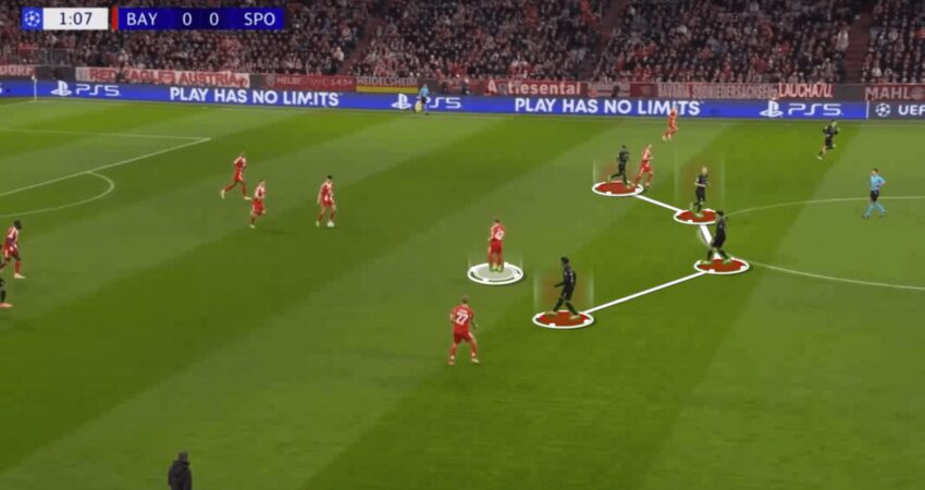Mund të shihet qartë se ku është shënuar me të kuqe linja e presingut sulmues të kundërshtarit dhe se si ai pozicionohet përpara saj, duke kërkuar hapësirat në mes.