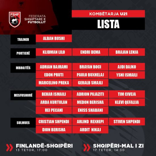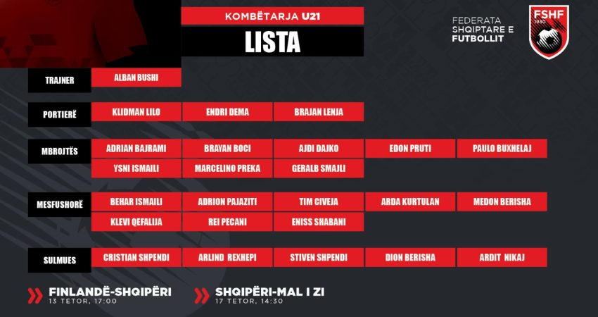 Gazeta Si – Trajneri i Kombëtares U-21, Alban Bushi, publikoi sot listën me 24 lojtarët e grumbulluar për dy ndeshjet kualifikuese të Euro 2025 ndaj Finlandës dhe Malit të Zi. Në këtë listë bëjnë pjesë 10 lojtarë nga kampionati shqiptar, të tjerët vijnë nga jashtë.