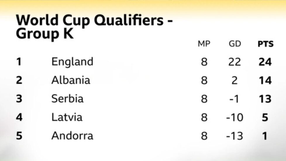 Skuadrat kryesojnë në dy vendet e para me 22 pikë Anglia dhe 15 Shqipëria.