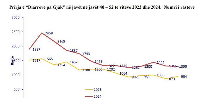 Megjithëse në raportin e Institutit të Shëndetit Publik nuk shpjegohen shkaqet e prekjes nga diarretë, nga grafiku shihet se në javën e 52-të, 23-29 2024 dhjetor janë 1300 raste, shifër e lartë në raport me të njëjtën periudhë të vitit të kaluar, kur janë regjistruar 954 raste.