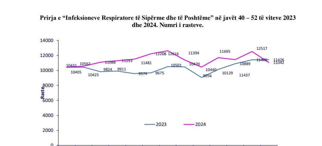 Krahasuar me vitin e kaluar në të njëjtën periudhë, konstatohet rritje e ndjeshme e rasteve me infeksione respiratore, 12.517 nga 11.406 që u regjistruan në 23-29 dhjetor 2023.