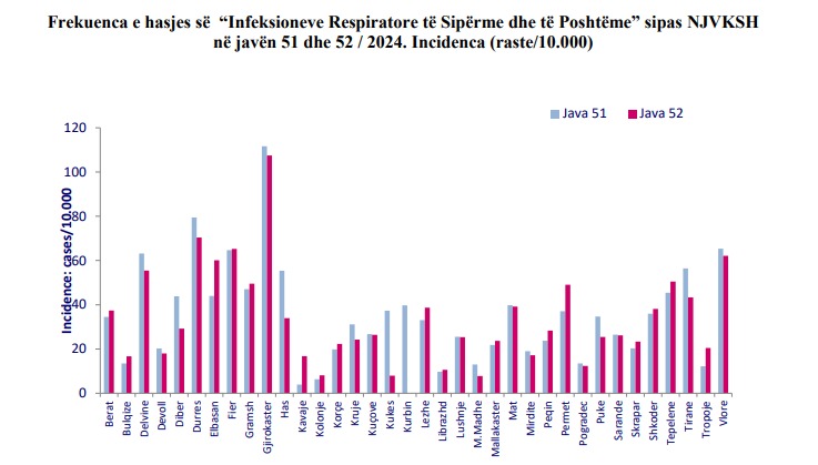 Nga të dhënat e dy javëve të fundit të muajit dhjetor, konstatohet se numri i rasteve me infeksione respiratore të sipërme dhe të poshtme, vijon të ketë prirje të qëndrueshme.