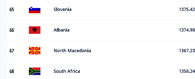 Kjo renditje përcaktohet me pikë, në bazë të ndeshjeve që luan çdo kombëtare dhe rezultateve që arrin. Kuqezinjtë, pas ndeshjeve kualifikuese të Botërorit të Katarit, kanë grumbulluar 1374.98 pikë. Ata qëndrojnë pas Sllovenisë dhe para Maqedonisë së Veriut.