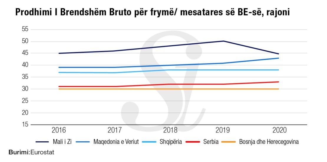 Në 2020-n është thelluar edhe diferenca me shtetet e tjera të rajonit. Pas Shqipërisë renditet Bosnjë-Hercegovina, me 33% të mesatares europiane. Në vitin 2016, diferenca mes këtyre dy shteteve më të varfra të Europës ishte 1 pikë përqindje, ndërsa në 2020-n është thelluar në tre pikë përqindje.