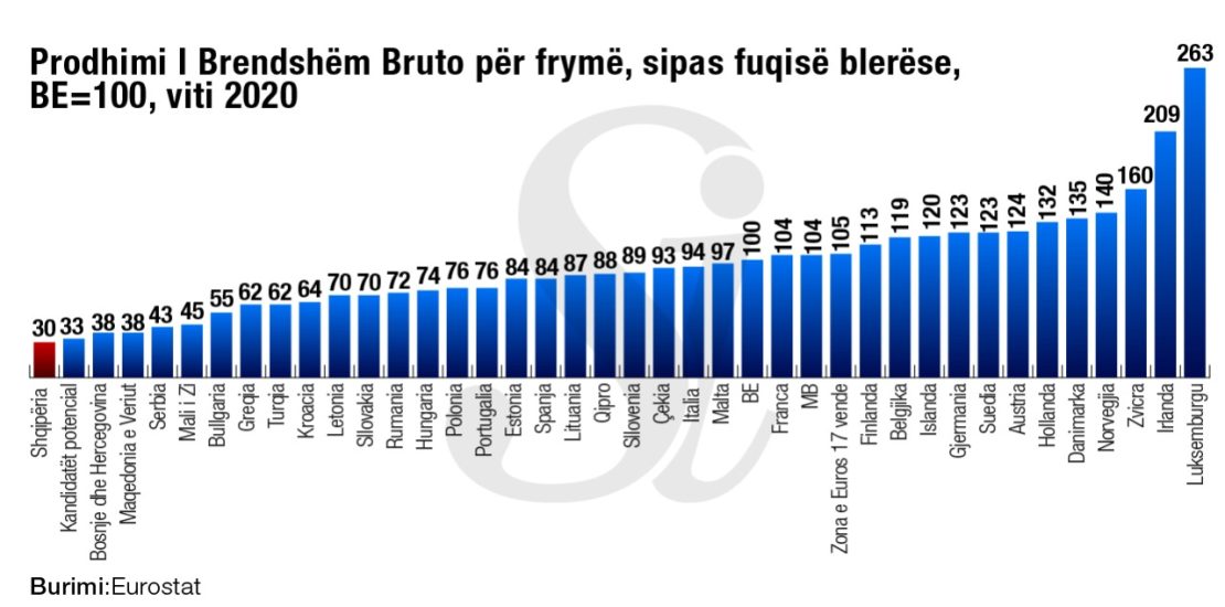 Që prej 2016-s, Prodhimi i Brendshëm Bruto për frymë ka mbetur në nivelin e 30% të mesatares europiane, duke mos bërë përpara në të ashtuquajturin proces të konvergjencës, që nënkupton që vendi ynë duhet të rritej më shpejt se mesatarja europiane, në mënyrë që të kapë sa më shpejt mesatares e BE-së.