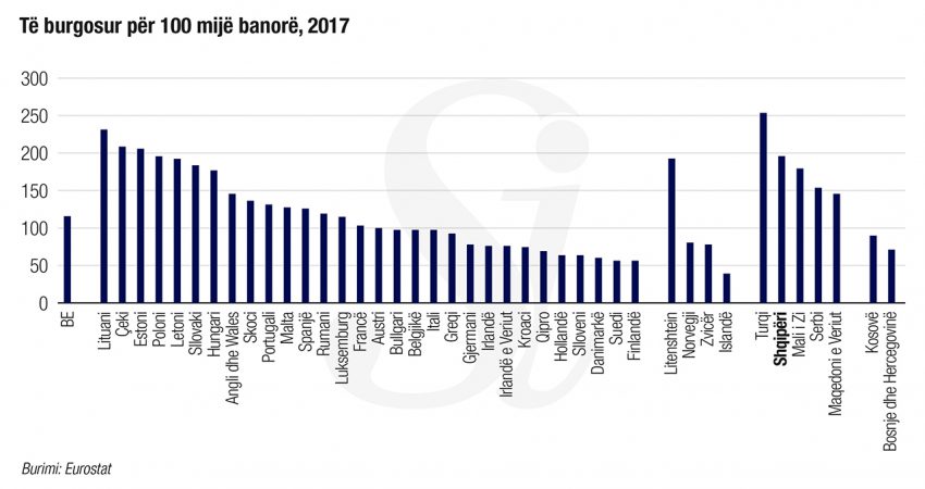 Shqipëria do të regjistronte më shumë të burgosur për 100 mijë banorë edhe më shumë se vendet e rajonit si Serbia, Mali i Zi, Bosnje Herzegovina, Kosova dhe Maqedonia e Veriut duke u renditur e para në rajon dhe e katërta në Europë për numër të burgosurish për 100 mijë banorë.