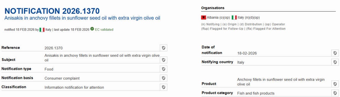 Nga Gazeta Si- Italia ka ndaluar një sasi filetosh sardelesh të përpunuara në vaj farash luledielli dhe vaj ekstra të virgjër, të importuara nga Shqipëria pasi përmbanin ‘Anisakis’, një lloj krimbi infektues për njerëzit.