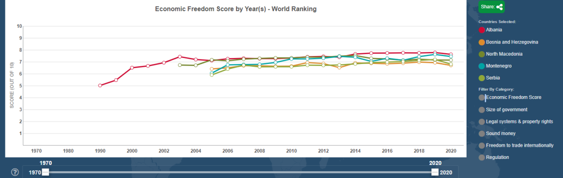 Gjithsesi nga renditja e fundit, Shqipëria ka humbur 5 vende. Raporti i Institutit Fraser ka analizuar të dhënat e 2020-s, ku Shqipëria ka një pikëzim prej 7.64 dhe në 2019-n kishte 7.79 pikë. Sa më afër 10-s, aq më i mirë vlerësimi.