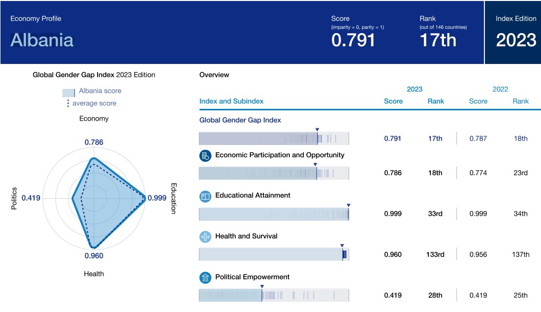 Gratë shqiptare renditen në vendin e 18 për pjesëmarrjen ekonomike dhe mundësitë, nga vendi i 23 të një viti më parë. Për arritjen të arsim renditemi në vendin e 33. Përmirësim ka edhe në treguesin për shëndetin dhe mbijetesën, duke u renditur në vendin e 133, katër pozicione më mirë se 2022.