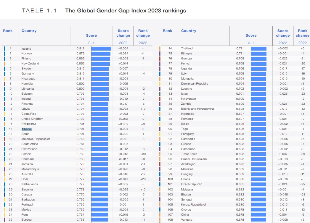 Nga Gazeta ‘SI’ – Shqipëria renditet në vendin e 17 në botë nga 146 shtete, në Indeksin e Hendekut Gjinor të vitit 2023, të publikuar nga Forumi Ekonomik Global, duke u përmirësuar me një pozicion.