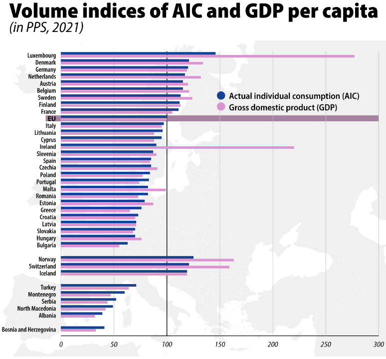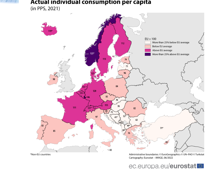 Sipas Eurostat, konsumi për frymë, tregon mirëqenien materiale të familjeve sipas vendeve, pa përfshirë diferencimet në çmime, ndërsa PBB-ja për frymë mat diferencimet nga shteti në shtet.