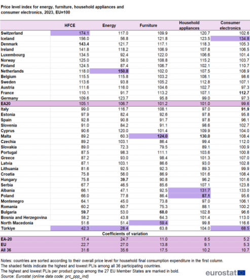 Në renditjen që bën Eurostat për vitin 2023, Shqipëria ka produktet më të shtrenjta të pajisjeve elektroshtëpiake në të gjithë vendet europiane, me një indeks prej 131.7. Mesatarja europiane është 101. Në këtë grup bëjnë pjesë të gjitha pajisjet e shtëpisë, nga frigoriferi, lavatriçe, furra etj.
