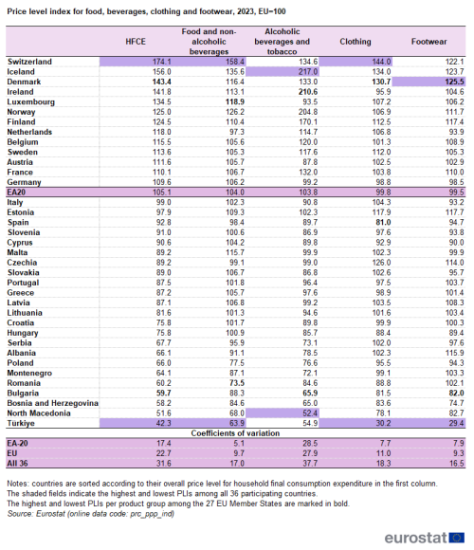 Ndër vendet e BE-së, Luksemburgu dhe Zvicra kanë çmimet më të shtrenjta të pijeve dhe ushqimeve, Irlanda të alkoolit dhe duhanit, Danimarka veshjet dhe këpucët. Në tërësi, Maqedonia e Veriut ka çmimet më të lira.