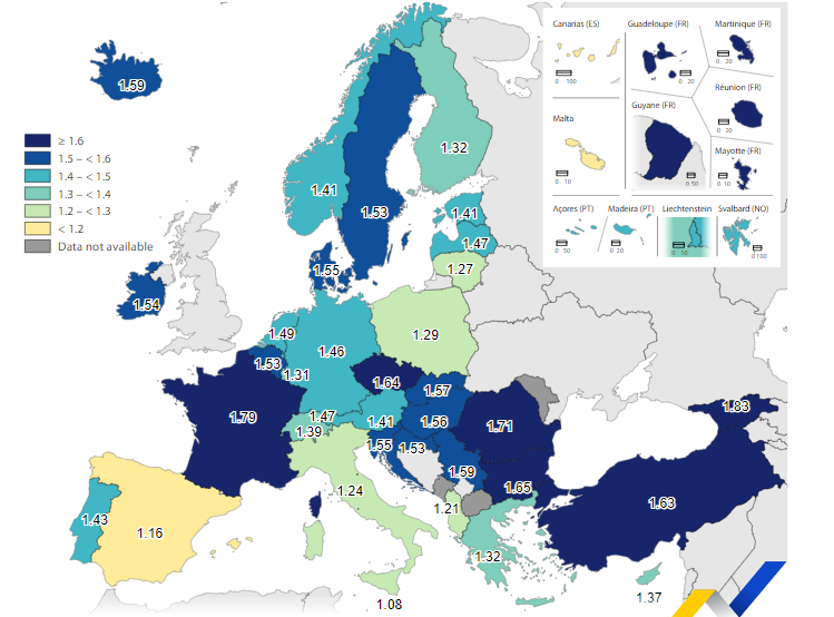 Norma totale e fertilitetit në vitin 2022 ishte 1.46 lindje për grua në BE, që është një tjetër rënie, pas rritjes së vogël të regjistruar në vitin 2021 (shkalla totale e lindshmërisë ishte 1.53 në 2021 dhe 1.51 në 2020).