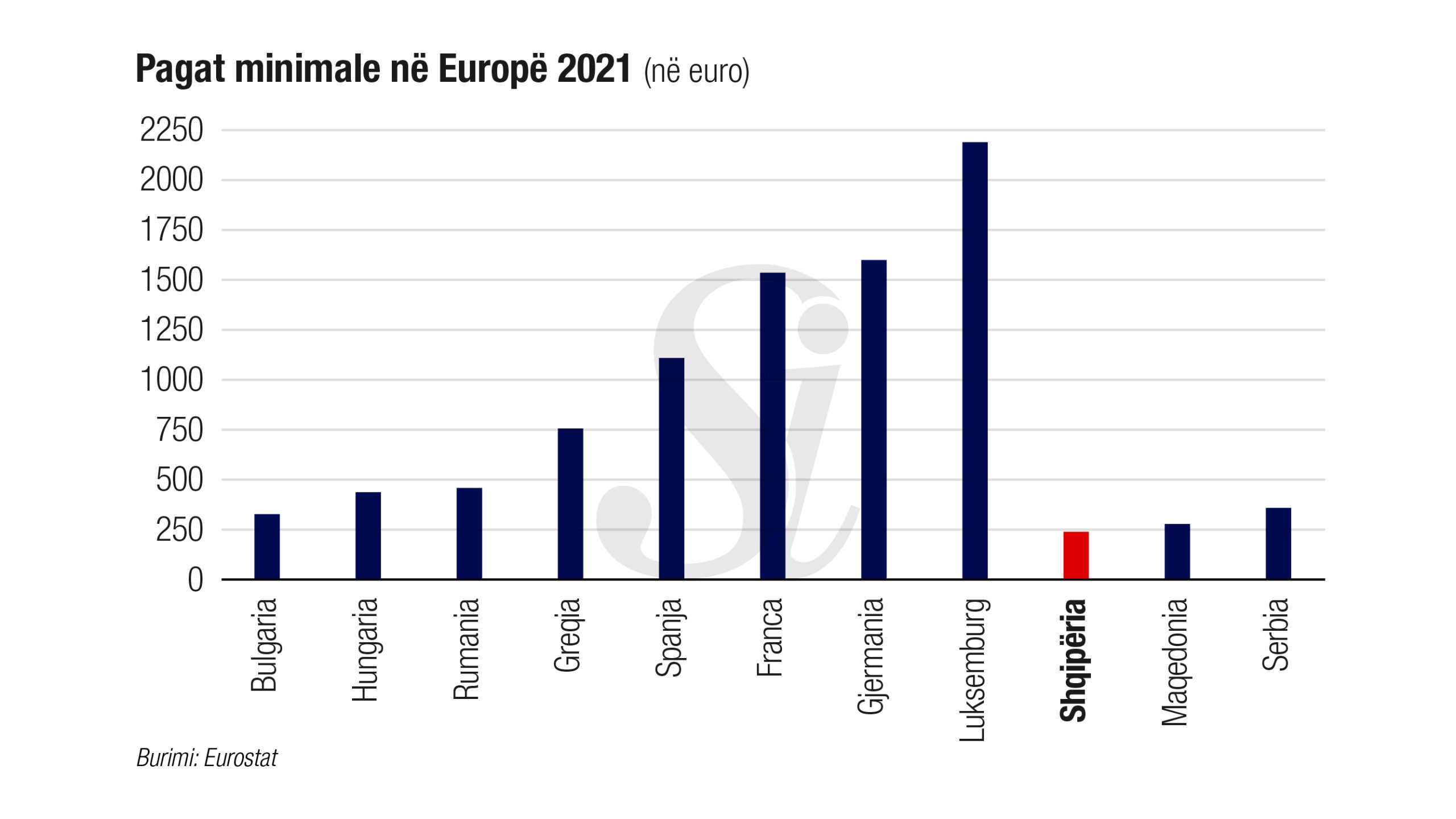 Sipas publikimeve të Eurostat mbi pagat minimale në Europë, Shqipëria ka pagën minimale më të ulët.