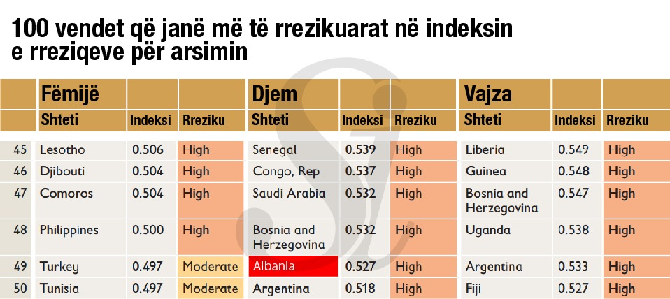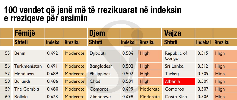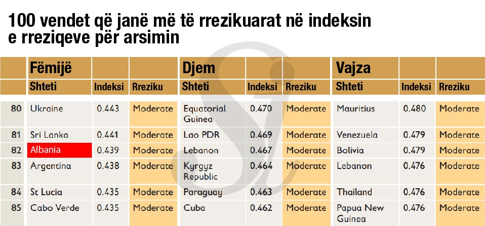 Në listën e 100 vendeve, Shqipëria renditet në vendin e 82, një pozicion që mund të cilësohet i mirë. Ajo që vihet re është se, ndarë me gjini, fëmijët meshkuj janë në vendin e 49 përsa i përket indeksit të rreziqeve ndërsa nxënëset femra janë në vendin e 58.