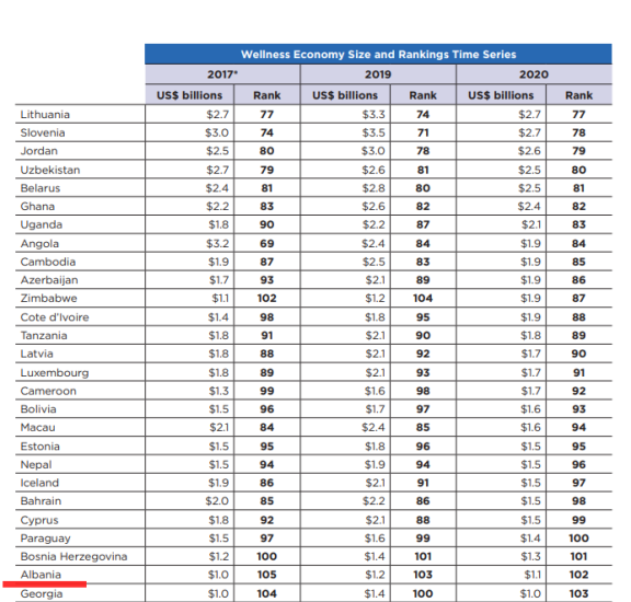 Instituti i Mirëqenies Globale, GWI, ka renditur Shqipërinë në vendin e 102-të në 150 vende sipas nivelit të mirëqenies ekonomike. Raporti tregon shifrat e vitit 2020, ku ekonomia e mirëqenies në vendin tonë zë 1.1 mld dollarë të tregut, me rënie nga viti 2019 me 0.1% mld, por me rritje renditjeje.