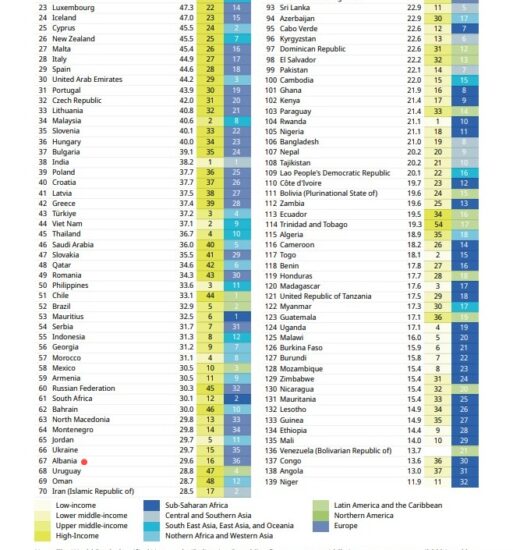 Sipas Indeksit Global të Inovacionit, nga WIPO, Shqipëria mban vendin e 67 nga 140 vende, por një vit më parë mbante vendin e 84-t.