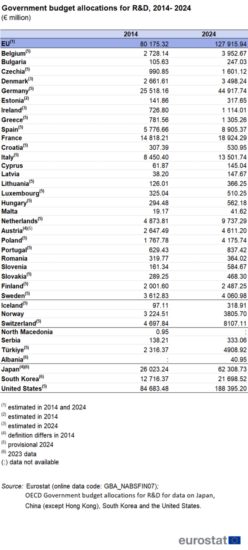 Shifrat e vitit 2024 nga Eurostat tregojnë se shpenzimet qeveritare për kërkim dhe zhvillim në Shqipëri ishin më të ulëtat, vetëm 40.9 mln euro, përkthyer në 0.19% të PBB-së së vendit.