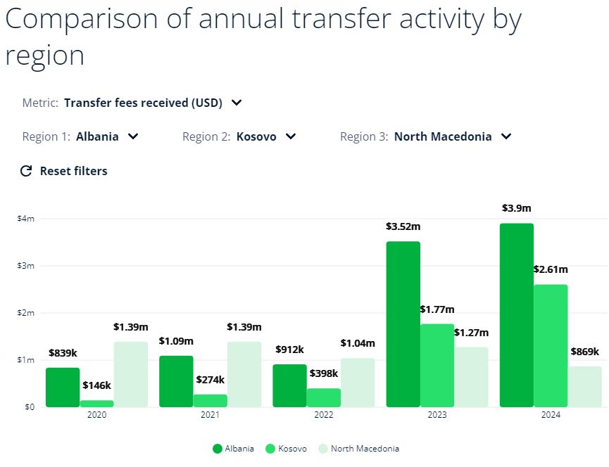 Lëvizjet mes shitjeve dhe blerjeve të lojtarëve në shifra në futbollin tonë janë më të larta, ashtu si edhe shpenzimet dhe përfitimet. Por nëse në shpenzime jemi thuajse të ngjashëm, mes 184 mijë dollarëve dhe 181 mijë dollarëve të presidentëve të Kosovës, në përfitime drejtuesit e klubeve shqiptare të futbollit kanë thyer rekord, jo vetëm duke lënë pas Kosovën me 1.3 milion dollarë diferencë, por edhe Maqedoninë e Veriut, meqë jemi tek rajoni që ka shpenzuar sa dyfishi jonë dhe ka përfituar nga shitjet vetëm diçka më tepër se 800 mijë dollarë.