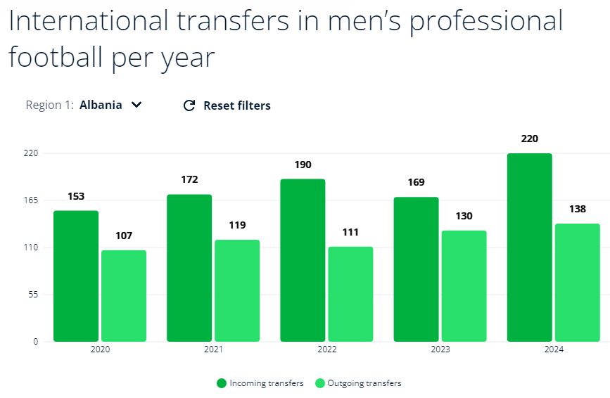 Por nisur nga fakti që ky raport është global, padyshim që në mes këtyre shifrave marramendëse bën pjesë edhe futbolli ynë. Në vitin e shkuar në futbollin shqiptar është arritur edhe rekordi i blerjeve të lojtarëve të huaj, 220 futbollistë, kjo me gjasë justifikon edhe shtimin e numrit të të huajve që mund të përdoren në një skuadër futbolli të kampionatit tonë nga 4 në 7 të tillë duke filluar nga ky janar i vitit 2025.