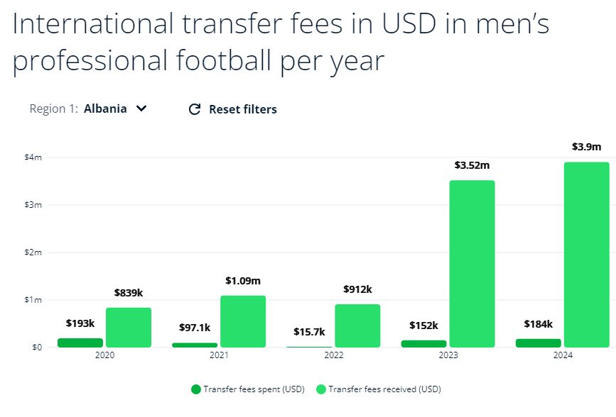 Kjo blerje e një numri të lartë lojtarësh nga klubet shqiptare sigurisht tregon edhe një gjendje relativisht të mirë financiare për investitorët e futbollit tonë, pasi nga shitjet e lojtarëve në vitin 2024, klubet shqiptare kanë përfituar 3.9 milion dollarë, dhe kjo vetëm për 138 futbollistë të shitur, shifra optimiste këto që tregojnë jo vetëm një rritje të vlerës së futbollistëve të rritur e formuar në Shqipëri, por edhe në përmirësimin e nivelit të skautëve apo presidentëve të futbollit shqiptarë, për të zgjedhur elementë edhe të huaj, të cilët me kalimin e kohës arrijnë t’i shesin më shtrenjtë.