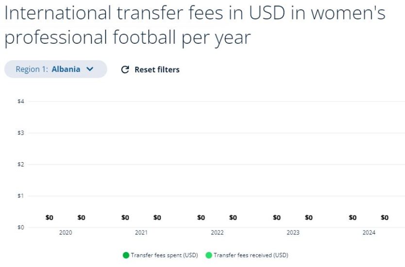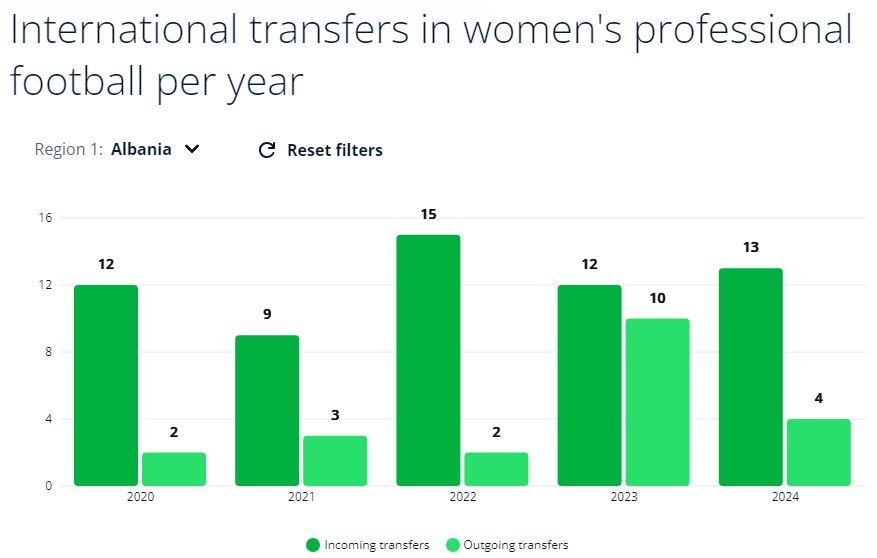 Ndërkohë në futbollin e femrave shifrat janë dukshëm shumë poshtë, në transferta me 13 lojtare të blera dhe vetëm 4 të shitura, të gjitha këto lëvizje me zero para të fituara apo shpenzuara.