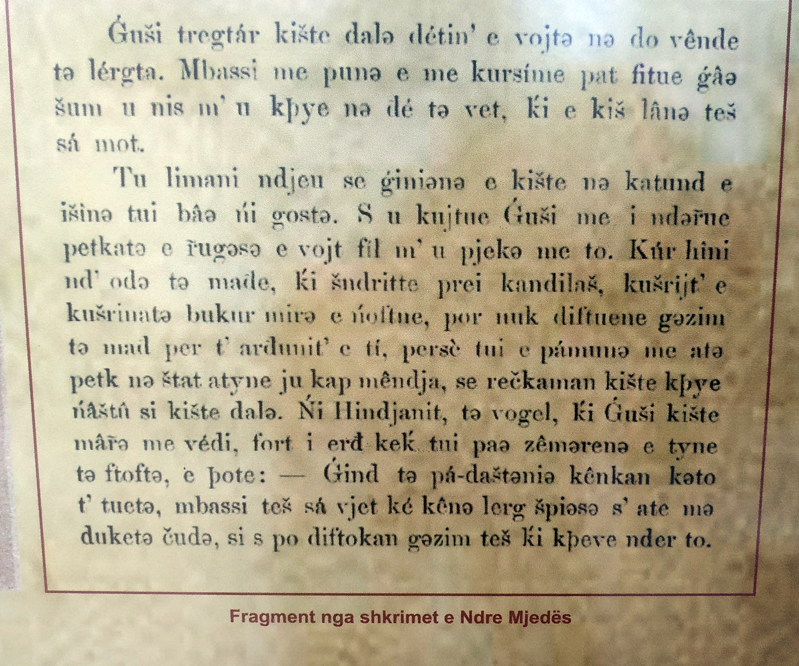 Ky fragment i shkëputur nga shkrimet e Ndre Mjedës tregon sesi e shkruante shqipen poeti dhe veprimtari, para vendosjes së alfabetit në Kongresin e Manastirit, më 1908-n, ku ai ishte përfaqësues i shoqërisë “Agimi”.