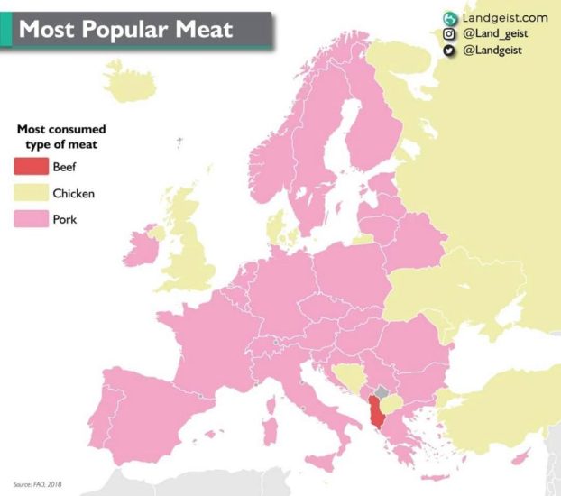 Në hartën e FAO-s mbi konsumin e mishrave, Shqipëria është vendi i vetëm që konsumon mishin e gjedhëve, shënjuar me ngjyrë të kuqe. Të gjitha vendet e tjera në Europë, janë konsumatorë të mishit të derrit, përveç Maqedonisë së Veriut, Bosnjë Hercegovinës, Rusisë dhe Mbretërisë së Bashkuar që preferojnë mishin e shpendëve.