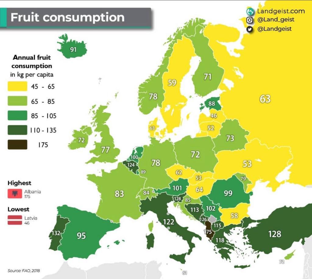 Sipas statistikave të Organizës Botërore të Ushqimit, FAO, Shqipëria konsumon 175 kg fruta për frymë në vit, që është shifra më e lartë sipas hartës. Ndjekur nga Portugalia me 132 kg për frymë.