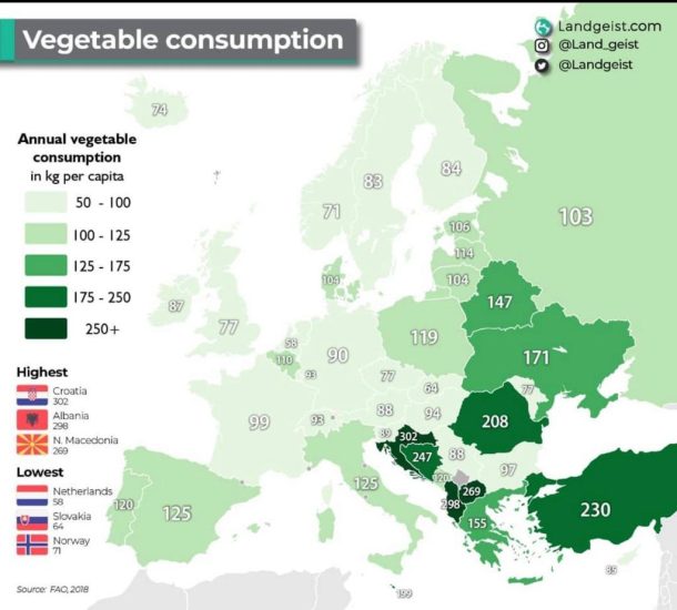 Holanda është vendi që preferon më pak perimet, me konsum vjetor për frymë vetëm 58 kg në vit, nga 50 minimalja.