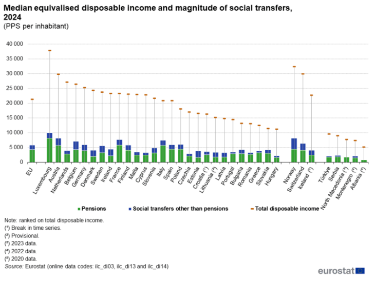 Sipas të dhënave të Eurostat, të ardhurat e disponueshme për shqiptarët , pra të ardhruat që mbeten pasi paguhen detyrimet + mbështetja sociale, vlerësohen në 5.000 PPS, një njësi që mat fuqinë blerëse reale të individëve. Kjo shifër tregon se qytetarët shqiptarë kanë mundësi më të kufizuara për të përballuar shpenzimet e përditshme krahasuar me vendet e tjera të Europës.