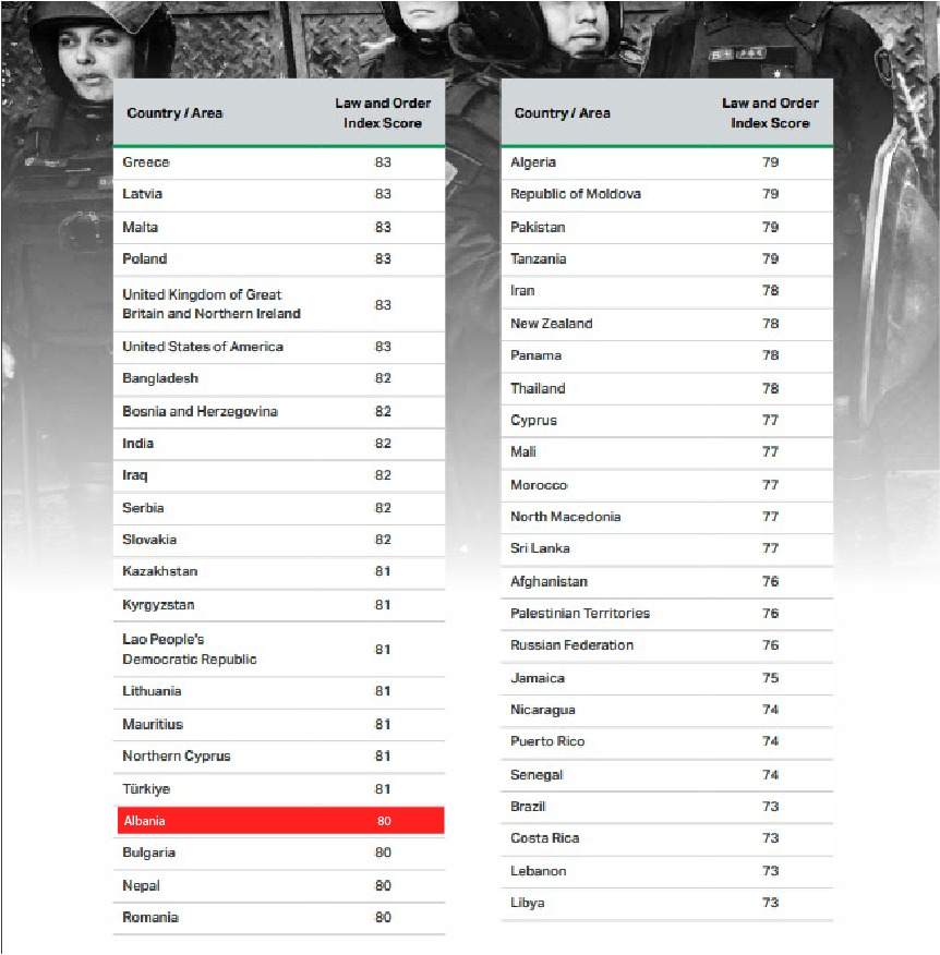 Shqipëria vlerësohet me 80 pikë në botë për sigurinë, sipas Indeksit të Ligjit dhe Rendit të Gallup për 2022. Sa më i lartë rezultati, aq më e lartë është përqindja e popullsisë që raporton se ndihet e sigurt.