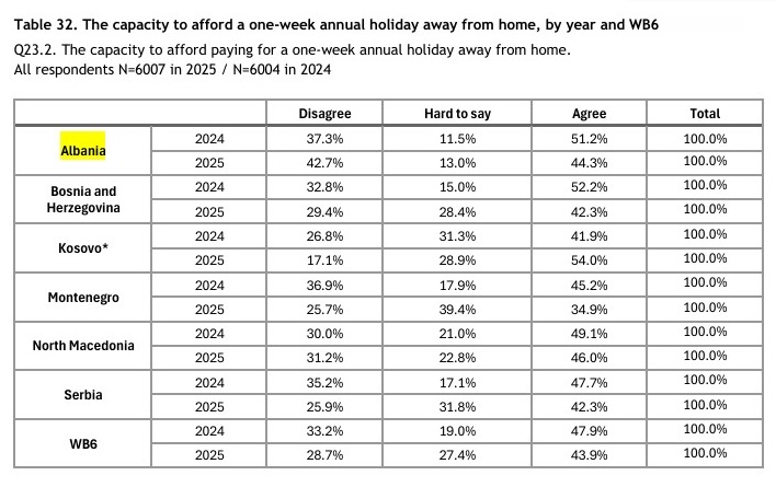 Edhe për mundësinë për të përballuar një javë pushime larg shtëpisë, situata mbetet sfiduese. Vetëm 44.3% e shqiptarëve thanë se mund të përballonin një javë pushime, një rënie nga viti i shkuar. Megjithatë, kjo është norma më e lartë pas Maqedonisë së Veriut (46%) në rajon, duke treguar se të tjerët përballen me presion financiar edhe më të madh.